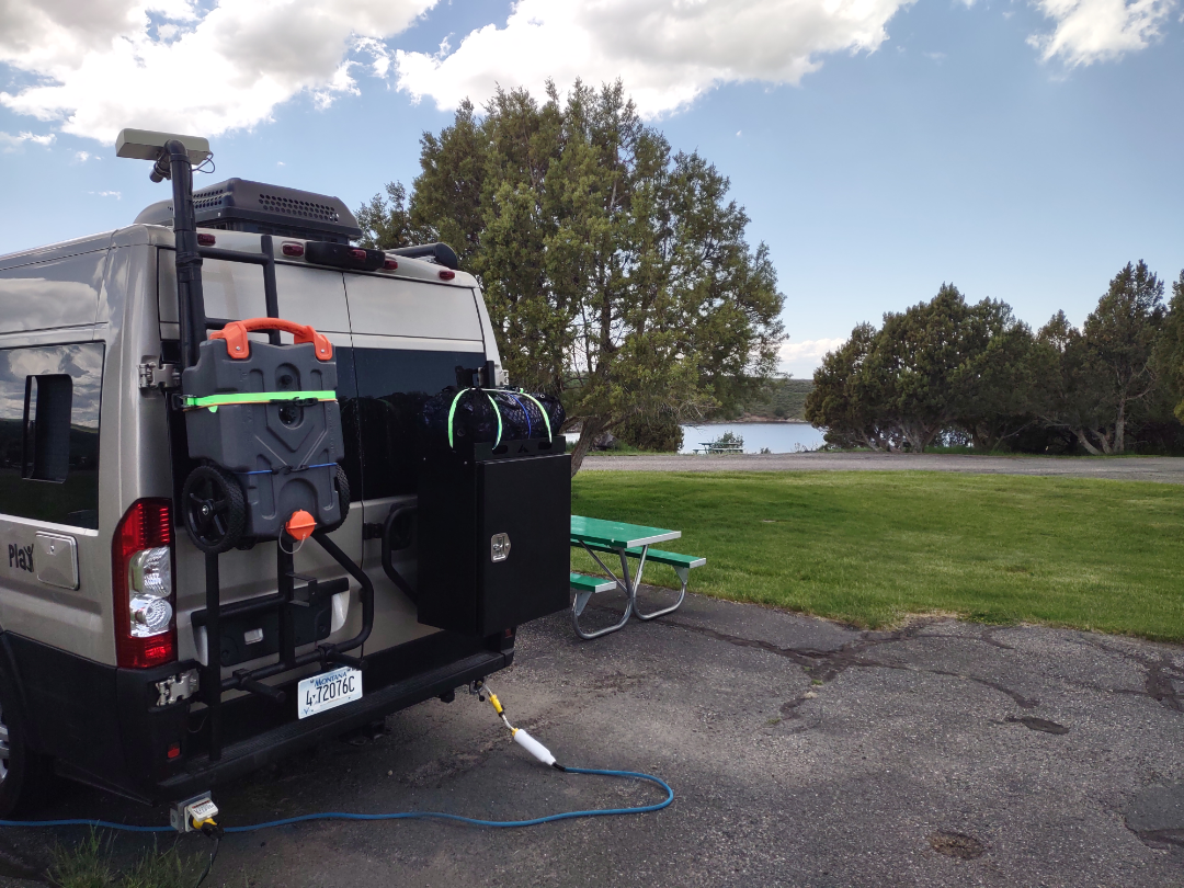 View of back of camper with reservoir in distance